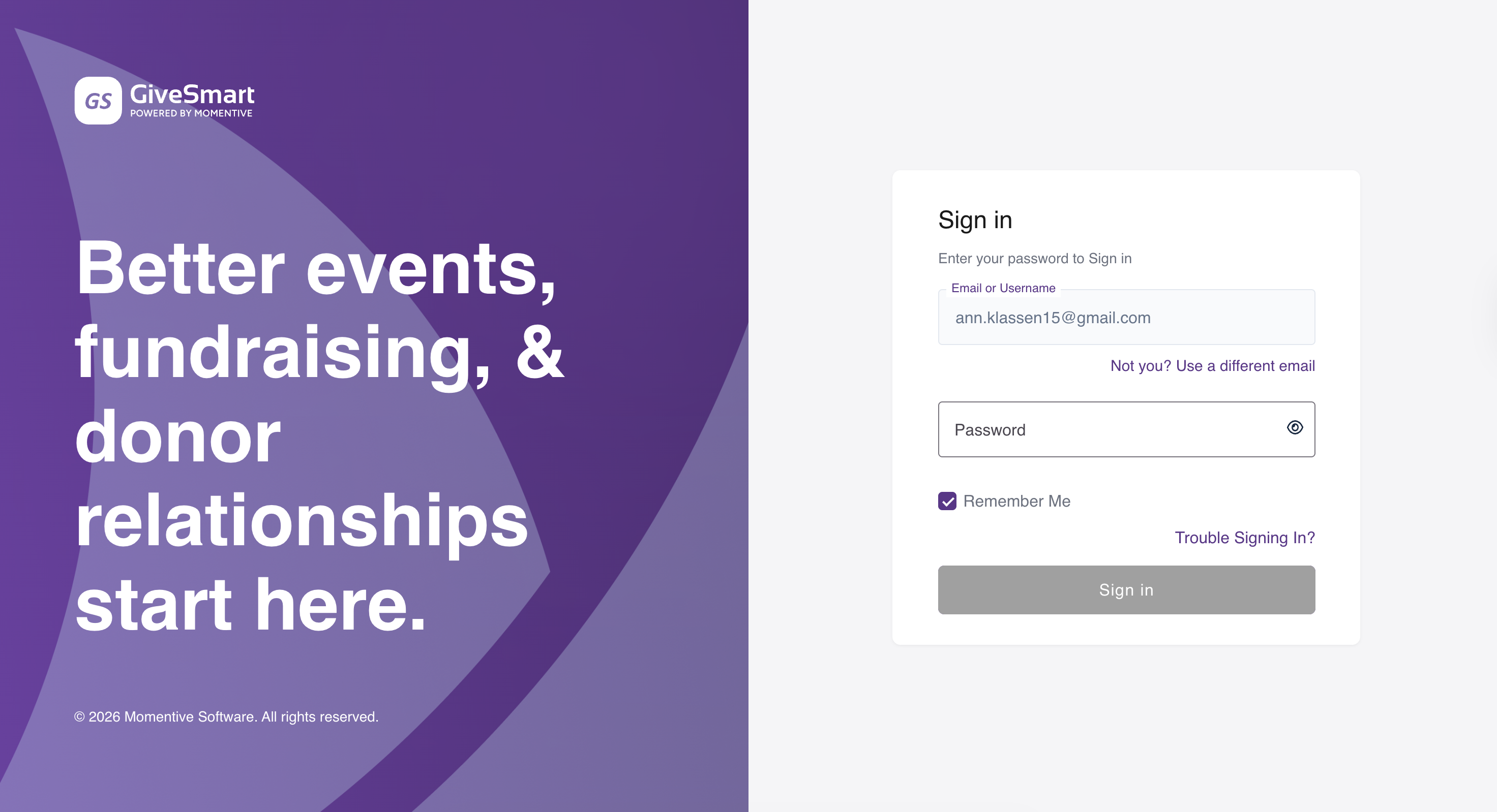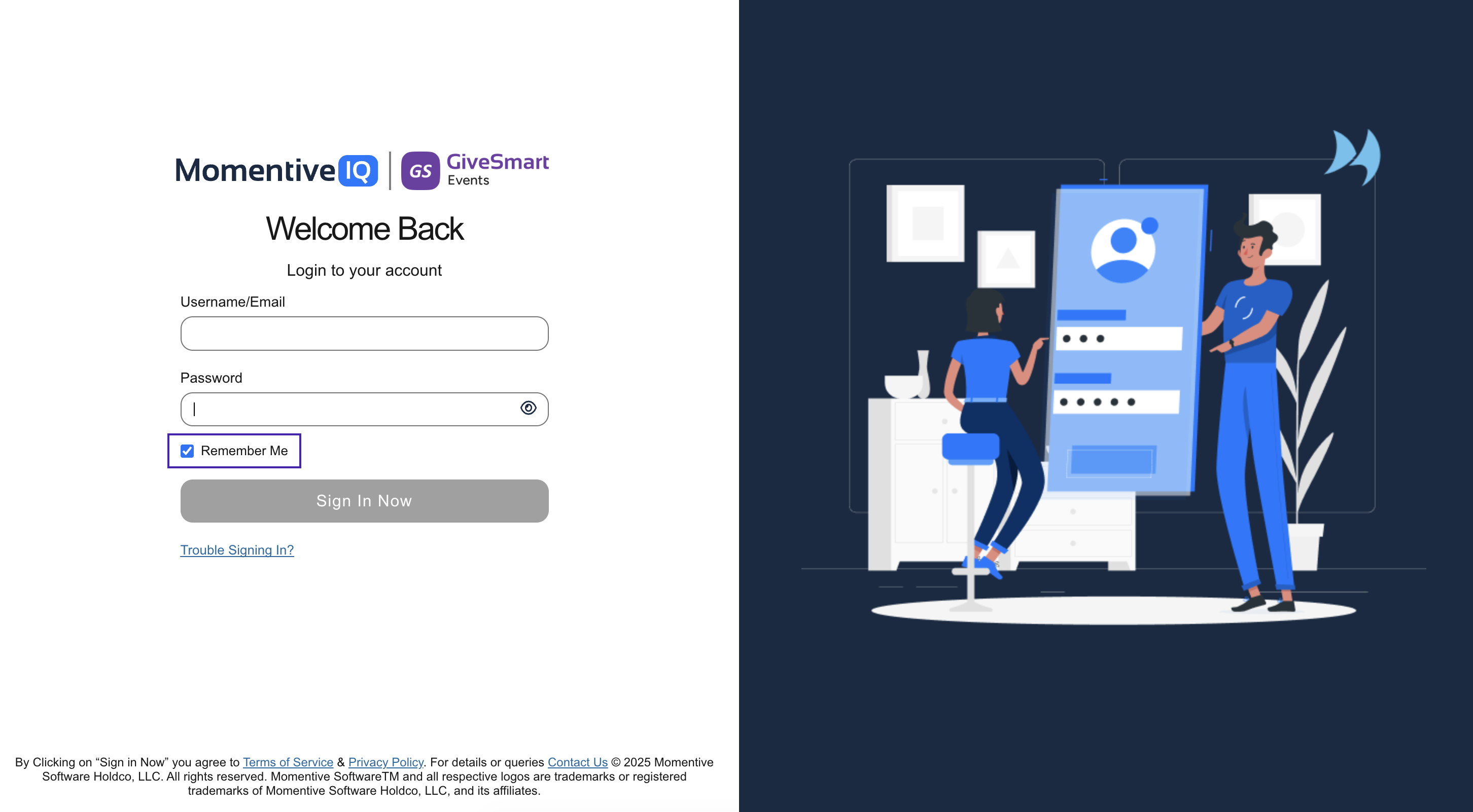 MomentiveIQ Identity introduces a single, secure login across GiveSmart modules: Donor CRM, Events, and Fundraise. This update improves security, simplifies access, and lets you move between products without logging in again.