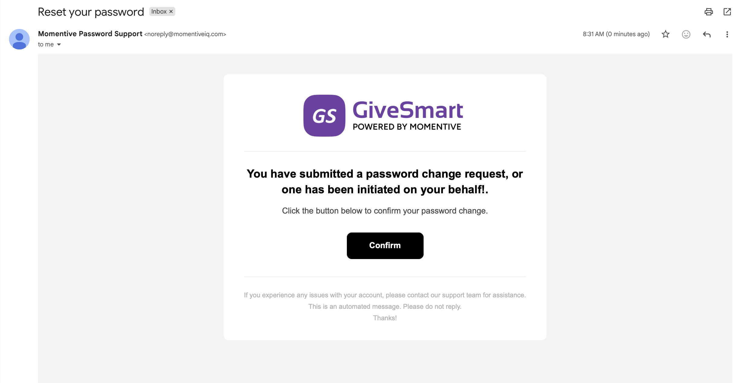 - Admins will receive an email from Momentive Password Support (<noreply@momentiveiq.com to set or reset their password.
