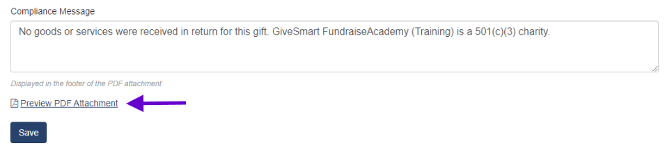 - PDF Message: This text displays at the top of the PDF receipt, below the organization name and logo.